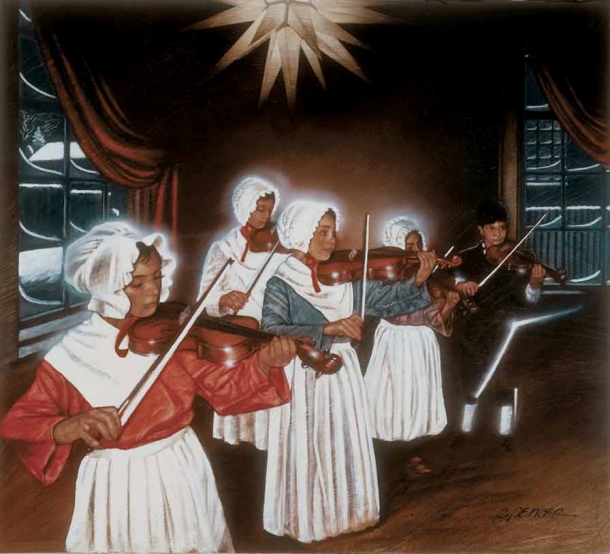 Christmas Concert at Old Salem takes place inside a home in Old Salem during the Christmas season. A blanket of freshly fallen snow outside helps set the mood that’s just right for the evening. The radiance from a fireplace glows upon the faces of the young musicians and their instruments as they play under a traditional Moravian star. Moravian children study their music lessons all year long, specifically for holiday and other traditional celebrations. Each child serenades the audience with their own tender chords played in praise to God.