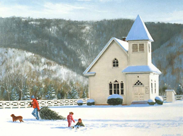 Dad and his kids are headed home with a Christmas tree specially chosen from the abundant evergreen forest near their home in the mountains. The church shown is Pine Grove Methodist in Wytheville, Virginia. There was a time when this winter scene was commonplace, but the practice has largely given way to a more convenient means, the local tree lot. Folks who grew up in rural areas during this bygone era still enjoy fond memories of this yearly ritual.