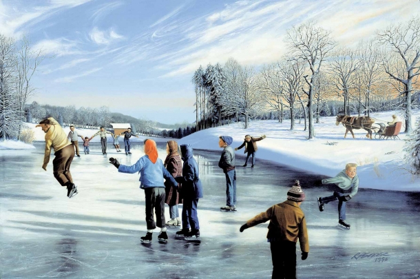 The painting displays a nostalgic view of rural life in the 1950s. Emotions ranging from excitement and bravado to fear and uncertainty are depicted in the paintings characters. In contrast to the high energy of the ice skating, a horse-drawn sleigh unhurriedly sweeps by, heading for home. Long shadows give notice to the coming twilight, marking the end of the day’s skating on this wintry holiday. It’s then that each character’s thoughts turn to hot chocolate and a warm hearth.
