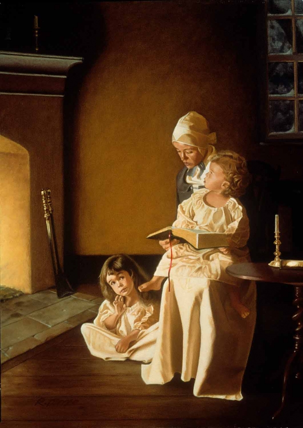 The cold night has fallen, muting the wilderness outdoors under winter’s serene hush. It is late December in the mid-18th century at Old Salem. Inside the house there is warmth, and near the glowing protection of a fireplace sit a young mother and her two small children. The mother reads aloud the Christmas story from the second chapter of Luke just before bedtime. The children listen, knowing intuitively, that this is the most wonderful story the Bible has to tell.